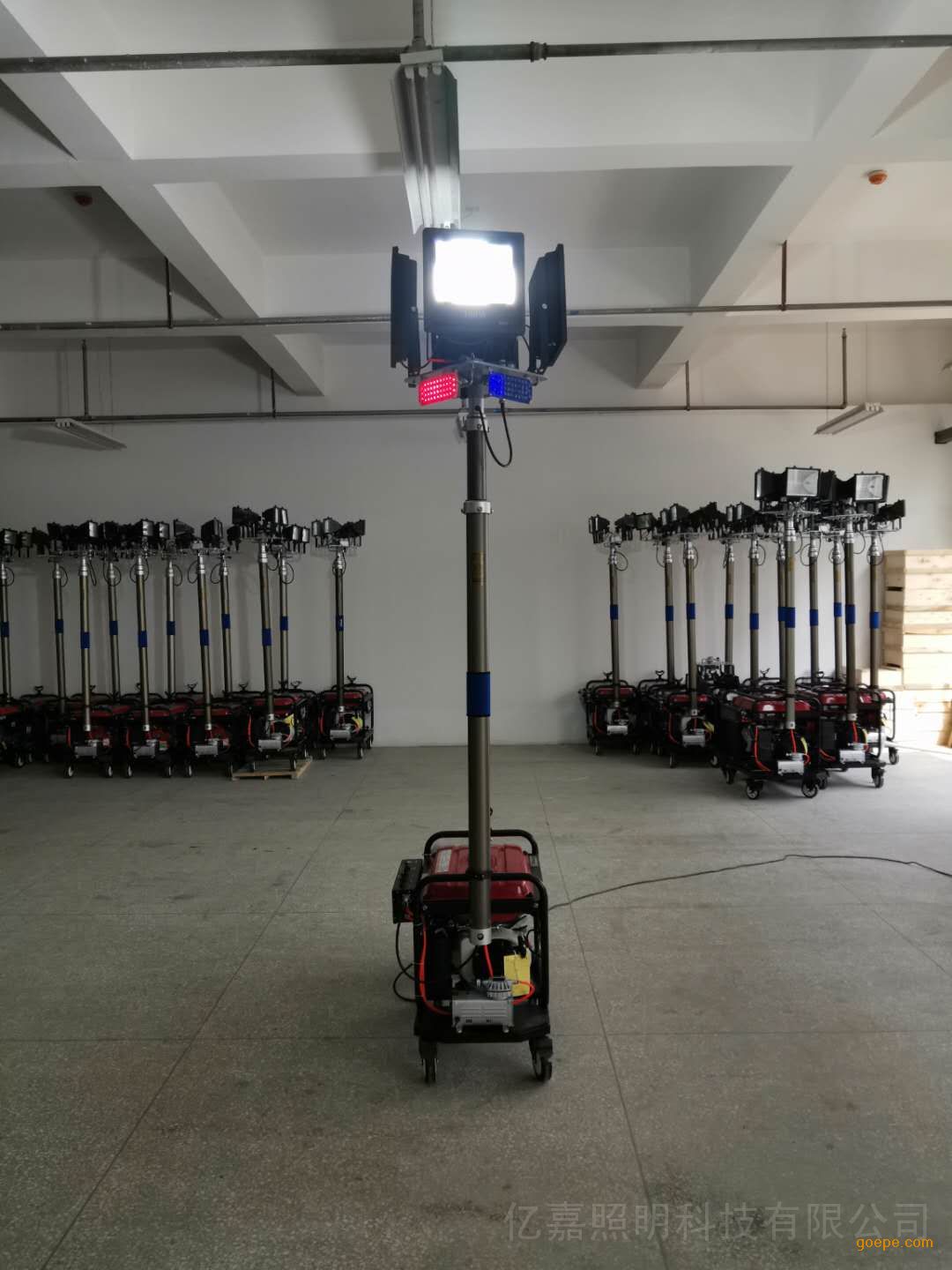 绿色亿嘉自动升降移动照明车防汛抢险应急照明泛光工作灯YJ6110B技术参数:序号 参数名称 参数值 1 额定电压/频率 AC220V/50HZ 2 光源功率(LS) 4×500W 3 连续工作时间 市电:长时间,